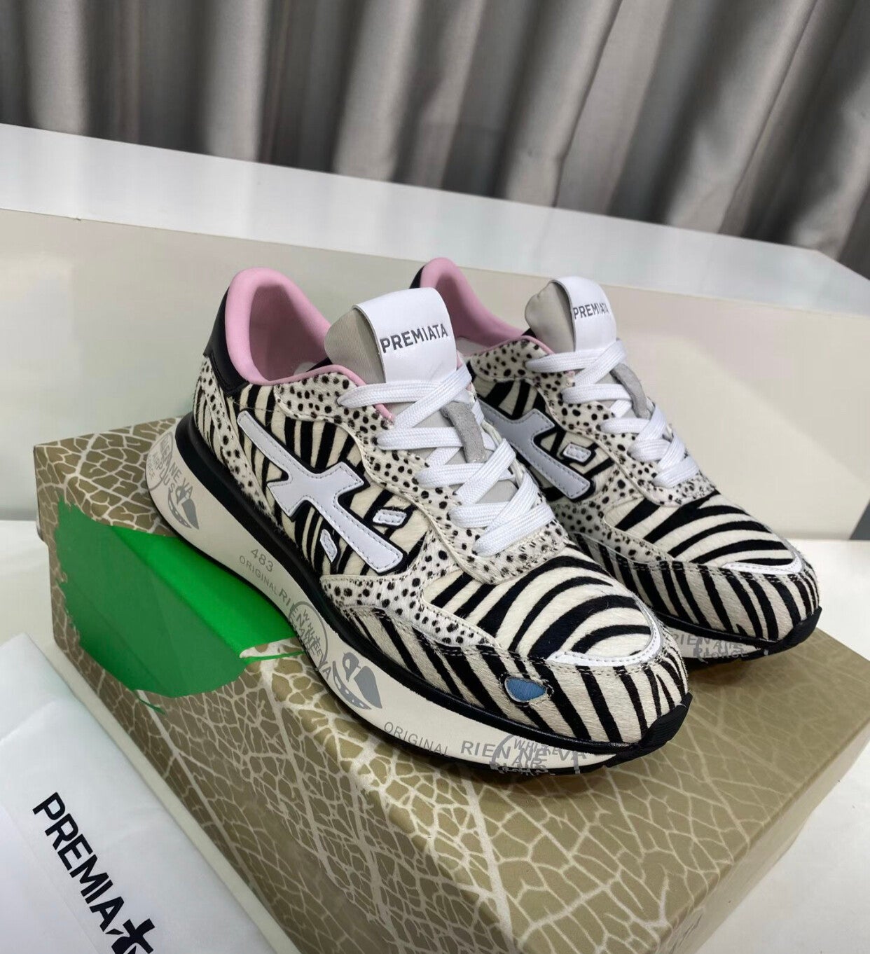 - Подошва: Легкая массивная подошва изготовлена из смеси EVA (этиленвинилацетат) и резины. Она украшена характерными для бренда надписями и штампами, включая "483 ORIGINAL" и "RIEN NE VA PLUS", что является визитной карточкой Premiata.